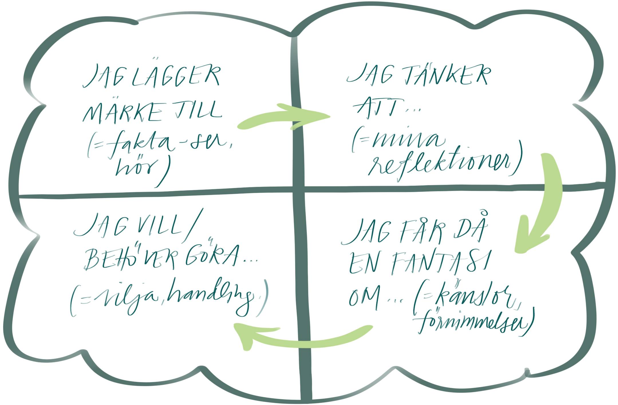 En modell för ökad medvetenhet. Jag lärde mig använda den för 15 år sen, på en utbildning i praktisk förändringsledning. Och jag har aldrig slutat. (Den har sitt urprung i gestaltteori.*) Den fungerar i samtal om skaviga situationer, i uppstart av samarbeten, när man vill förstå varför något hakar upp sig, eller ta tempen på en grupp. Den hjälper till att: